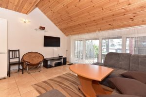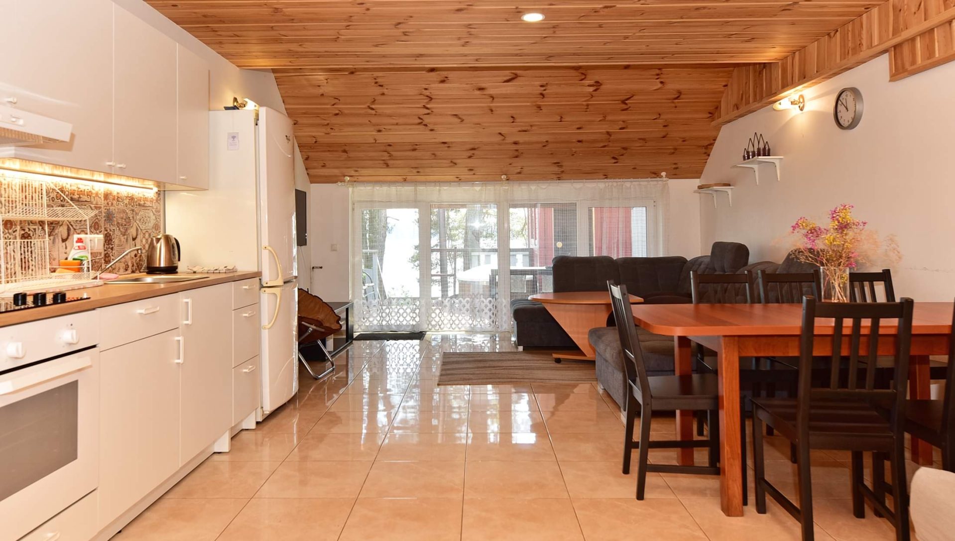 Dviejų aukštų kotedžiukas ant ežero kranto. Pirmame aukšte svetainė su virtuve, tualetas, dušas. Įrengtas grindinis šildymas. Stovi sofa-lova, minkštas kampas, valgomasis stalas. Antrame aukšte viena dvigulė ir viena viengulė lovos. Viso kotedžiuke 6 miegamos vietos. Yra televizorius, internetas. Įrengtas kondicionierius. Įrengta terasa su kubilu ir pirtimi. Iš terasos nusileidimas laiptais iki pat ežero. Lauke pavėsinė, kurioje telpa 6 žmonės. Šalia vaikų žaidimų aikštelė. Įrengtas krantas maudytis bei keturi lieptai. Pakrante ir lieptais naudojasi 7A, 7B, 7C, 7D kotedžiukų gyventojai.
